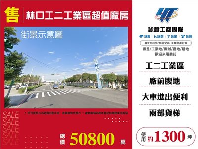 《詠騰工商團隊》 專營桃園廠房工業地出售出租 案名:林口工二工業區超值廠房 [價格]:50800萬 [坪數]:約1300坪【權狀+未登記增建坪數】 [周邊]:工二工業區