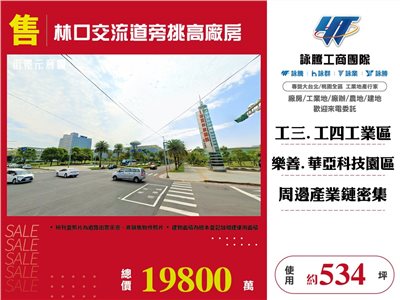 《詠騰工商團隊》 專營桃園廠房工業地出售出租 案名:林口交流道旁挑高廠房 [價格]:19800萬 [坪數]:約534坪【權狀+未登記增建坪數】 [周邊]:工四工業區