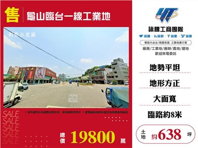 《詠騰工商團隊》 專營桃園工業地廠房出租出售 案名:龜山臨台一線工業地 [價格]:19800萬 [坪數]:約638坪 [交通]:台一線