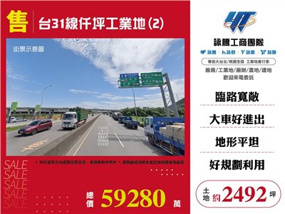 《詠騰工商團隊》 專營桃園工業地廠房出租出售 案名:台31線仟坪工業地(2) [價格]:59280萬 [坪數]:約2492坪 [交通]: 66快速路