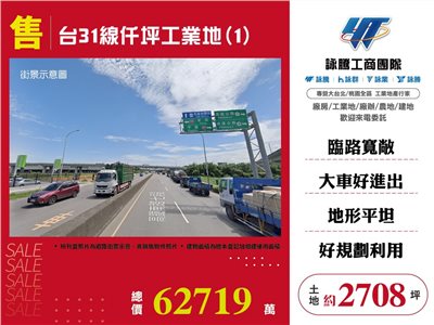 《詠騰工商團隊》 專營桃園工業地廠房出租出售 案名:台31線仟坪工業地(1) [價格]:62719萬 [坪數]:約2708坪 [交通]: 66快速路