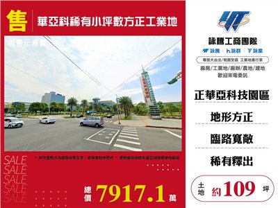 《詠騰工商團隊》 專營桃園工業地廠房出租出售 案名:華亞科稀有小坪數方正工業地 [價格]:7917.1萬 [坪數]:約109坪【權狀+增建坪數】 [地理位置]:華亞科技園區