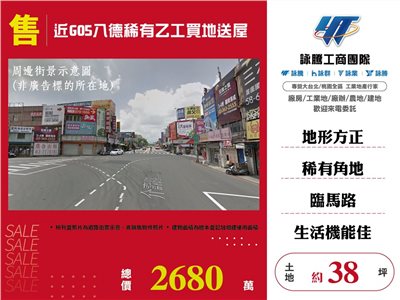 《詠騰工商團隊》 專營桃園工業地廠房出租出售 案名:近G05八德稀有乙工買地送屋 [價格]:2680萬 [坪數]:約38坪【權狀+增建坪數】 [地理位置]:近未來捷運G05站