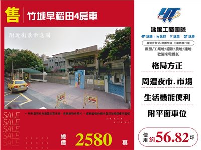 《詠騰工商團隊》 專營桃園房地產出租出售 案名:竹城早稻田4房車 [價格]:2580萬 [坪數]:約56.82坪 [周邊]:東埔公園