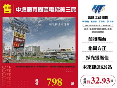 《詠騰工商團隊》 專營桃園房地產出租出售 案名:中壢體育園區電梯美三房 [價格]:798萬 [坪數]:約32.93坪 [周邊]:仁美公園