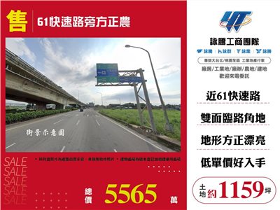 《詠騰工商團隊》 專營桃園工業地廠房出租出售 案名:61快速路旁方正農 [價格]:5565萬 [坪數]:約1159坪【權狀+增建坪數】 [地理位置]:近61快速道路