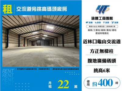 《詠騰工商團隊》 專營桃園工業地廠房出租出售 案名:交流道旁挑高碼頭廠房 [租金]:22萬 [坪數]:約400坪【權狀+增建坪數】 [地理位置]:近林口龜山交流道