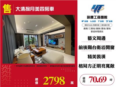 《詠騰工商團隊》 專營桃園房地產出租出售 案名:大清掬月四房車 [價格]:2798萬 [坪數]:70.6坪【權狀+增建坪數】 [地理位置:近國1、2交流道