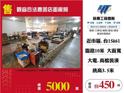 《詠騰工商團隊》 專營桃園廠房工業地出售出租 案名:觀音合法農舍店面廠房 [價格]:5000萬 [坪數]:約450坪【權狀+增建坪數】 [地理位置]:近觀音市區