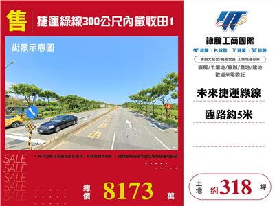 《詠騰工商團隊》 專營桃園工業地廠房出租出售 案名:捷運綠線300公尺內徵收田1 [價格]:8173萬 [坪數]:約318坪 [周邊]:未來捷運綠線