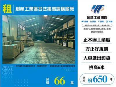 《詠騰工商團隊》 專營桃園工業地廠房出租出售 案名:樹林工業區合法挑高鋼構廠房 [租金]:66萬 [坪數]:約650坪【權狀+增建坪數】 [地理位置]:樹林木器工業區