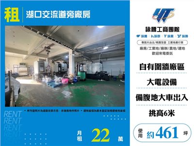 《詠騰工商團隊》 專營桃園工業地廠房出租出售 案名:湖口交流道旁廠房 [租金]:22萬 [坪數]:約461坪【權狀+增建坪數】 [地理位置]:近交流道