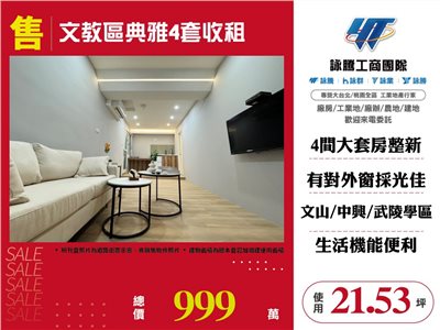 《詠騰工商團隊》 專營桃園房地產出租出售 案名:文教區典雅4套收租 [價格]:999萬 [坪數]:21.53坪【權狀+增建坪數】 [地理位置: 近文山國小