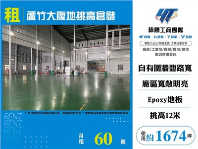 《詠騰工商團隊》 專營桃園工業地廠房出租出售 案名:蘆竹大腹地挑高倉庫 [租金]:60萬 [坪數]:1674坪【權狀+增建坪數】 [地理位置]:近南崁交流道
