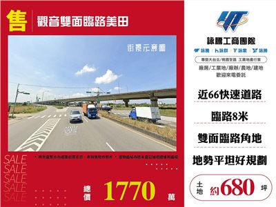《詠騰工商團隊》 專營桃園工業地廠房出租出售 案名:觀音雙面臨路美田 [價格]:1770萬 [坪數]:680坪【權狀+增建坪數】 [地理位置]:近66快速道路