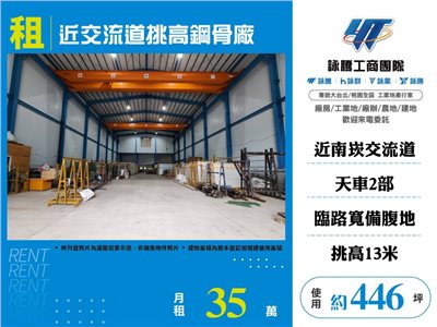 《詠騰工商團隊》 專營桃園工業地廠房出租出售 案名:近交流道挑高鋼骨廠房 [租金]:35萬 [坪數]:446坪【權狀+增建坪數】 [地理位置]:近交流道