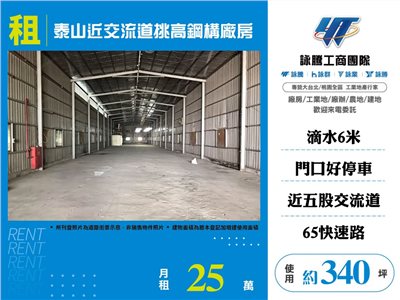 《詠騰工商團隊》 專營桃園工業地廠房出租出售 案名:泰山近交流道挑高鋼構廠房 [租金]:25萬 [坪數]:340坪【權狀+增建坪數】 [地理位置]:近五股交流道