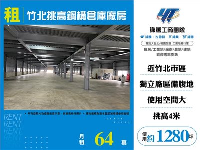 《詠騰工商團隊》 專營桃園工業地廠房出租出售 案名:竹北挑高鋼構倉庫廠房 [租金]:64萬 [坪數]:1280坪【權狀+增建坪數】 [地理位置]:近竹北市區