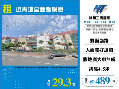 《詠騰工商團隊》 專營桃園工業地廠房出租出售 案名:近青埔全新鋼構廠房 [租金]:29.3萬 [坪數]:489坪【權狀+增建坪數】 [地理位置]:近交流道
