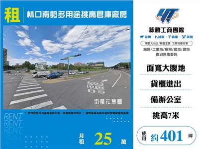 《詠騰工商團隊》 專營桃園工業地廠房出租出售 案名:林口南勢多用途挑高倉庫廠房 [價格]:25萬 [坪數]:約401坪【權狀+增建坪數】 [地理位置]:近林口交流道