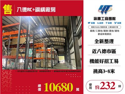 《詠騰工商團隊》 專營桃園廠房工業地出售出租 案名:八德RC+鋼構廠房 [價格]:10680萬 [坪數]:約232坪【權狀+增建坪數】 [地理位置]:近交流道