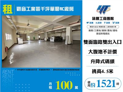 《詠騰工商團隊》 專營桃園工業地廠房出租出售 案名:觀音工業區千坪單層RC廠房 [租金]:100萬 [坪數]:約1521坪【權狀+增建坪數】 [地理位置]:觀音工業區