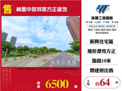 《詠騰工商團隊》 專營桃園工業地廠房出租出售 案名:桃園中路特區方正建地 [價格]:6500萬 [坪數]:64坪【權狀+增建坪數】 [地理位置]:中路重劃區