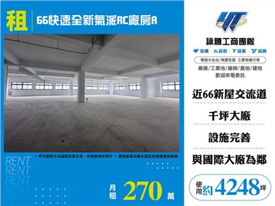 《詠騰工商團隊》 專營桃園工業地廠房出租出售 案名:66快速全新氣派RC廠房A [租金]:270萬 [坪數]:4248坪【權狀+增建坪數】 [地理位置]:近66快速道路