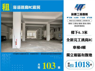 《詠騰工商團隊》 專營桃園工業地廠房出租出售 案名:海湖挑高RC廠房 [租金]:103萬 [坪數]:1018坪【權狀+增建坪數】 [地理位置]:海湖工業區