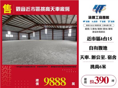 《詠騰工商團隊》 專營桃園廠房工業地出售出租 案名:觀音近市區挑高天車廠房 [價格]:9888萬 [坪數]:約390坪【權狀+增建坪數】 [地理位置]:近台15線