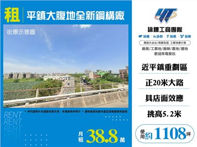 《詠騰工商團隊》 專營桃園工業地廠房出租出售 案名:平鎮大腹地全新鋼構廠房 [租金]:38.8萬 [坪數]:1108坪【權狀+增建坪數】 [地理位置]:近平鎮工業區