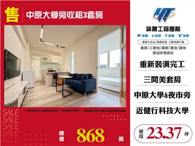 《詠騰工商團隊》 專營桃園房地產出租出售 案名:中原大學旁收租3套房 [價格]:868萬 [坪數]:23.37坪【權狀+增建坪數】 [地理位置]:近中原大學