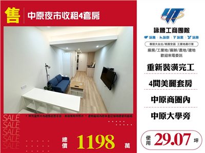 《詠騰工商團隊》 專營桃園房地產出租出售 案名:中原夜市收租4套房 [價格]:1198萬 [坪數]:29.07坪【權狀+增建坪數】 [地理位置]:近中原大學