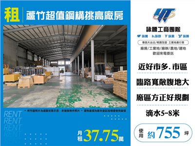 《詠騰工商團隊》 專營桃園工業地廠房出租出售 案名:蘆竹超值鋼構挑高廠房 [租金]:37.75萬 [坪數]:755坪【權狀+增建坪數】 [地理位置]:近南崁市區