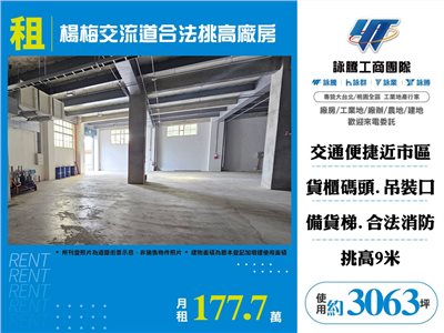 《詠騰工商團隊》 專營桃園工業地廠房出租出售 案名:楊梅交流道合法挑高廠房 [租金]:177.7萬 [坪數]:3063坪【權狀+增建坪數】 [地理位置]:近楊梅交流道