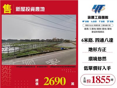 《詠騰工商團隊》 專營桃園工業地廠房出租出售 案名:新屋投資農地 [價格]:2690萬 [坪數]:1855坪【權狀+增建坪數】 [地理位置]:近交流道