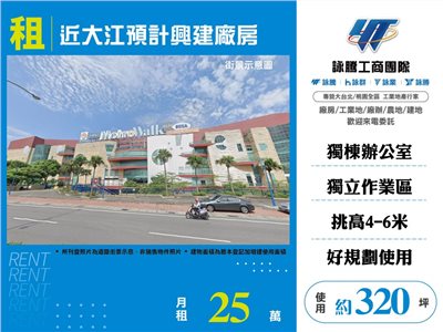《詠騰工商團隊》 專營桃園工業地廠房出租出售 案名:近大江預計興建廠房 [租金]:25 [坪數]:320坪【權狀+增建坪數】 [地理位置]:近交流道