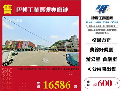 《詠騰工商團隊》 專營桃園廠房工業地出售出租 案名:巴頓工業區漂亮廠辦 [價格]:16586萬 [坪數]:約600坪【權狀+未登記增建坪數】 [交通]:新北迴龍、省道