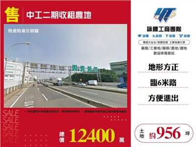 《詠騰工商團隊》 專營桃園工業地廠房出租出售 案名:中工二期收租農地 [價格]:12400萬 [坪數]:約956坪【權狀+增建坪數】 [地理位置]:中壢工業區二期