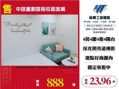 《詠騰工商團隊》 專營桃園房地產出租出售 案名:中路重劃區旁收租美寓 [價格]:888萬 [坪數]:23.96坪【權狀+增建坪數】 [地理位置]:近中路重劃區