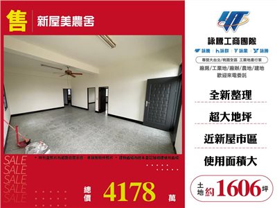 《詠騰工商團隊》 專營桃園工業地廠房出租出售 案名:新屋美農舍 [價格]:4178萬 [土地坪數]:約1606坪【權狀+增建坪數】 [建物使用面積]:約74坪【權狀+增建坪數】 [地理位置]:近新屋市區
