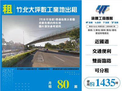 《詠騰工商團隊》 專營桃園工業地廠房出租出售 案名:竹北大坪數工業地出租(可分租) [租金]:80萬 [坪數]:約1435坪【權狀+增建坪數】 [地理位置]:近國道