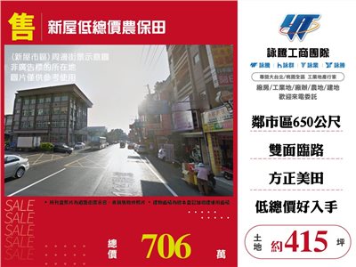 《詠騰工商團隊》 專營桃園工業地廠房出租出售 案名:新屋低總價農保田 [價格]:706萬 [坪數]:約415坪【權狀+增建坪數】 [地理位置]:近新屋市區