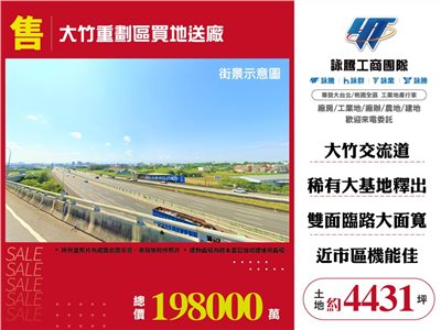 《詠騰工商團隊》 專營桃園工業地廠房出租出售 案名:大竹重劃區買地送廠 [價格]:198000萬 [坪數]:約4431坪【權狀+增建坪數】 [地理位置]:近大竹交流道