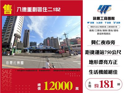 《詠騰工商團隊》 專營桃園工業地廠房出租出售 案名:八德重劃區住二 [價格]:12000萬 [坪數]:約181坪【權狀+增建坪數】 [地理位置]:八德擴大重劃區