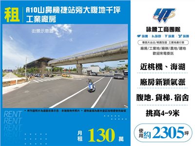 《詠騰工商團隊》 專營桃園工業地廠房出租出售 案名:A10山鼻機捷站旁大腹地千坪工業廠房 [租金]:130萬 [坪數]:約2305坪【權狀+增建坪數】 [地理位置]:近海湖工業區