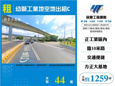 《詠騰工商團隊》 專營桃園工業地廠房出租出售 案名:幼獅工業地空地出租C [租金]:44萬 [坪數]:約1259坪【權狀+增建坪數】 [地理位置]:近幼獅交流道