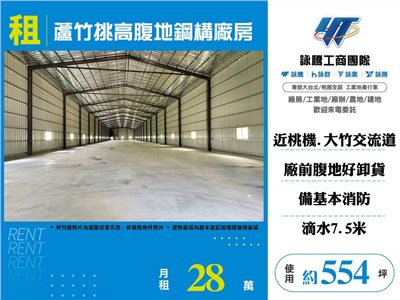 《詠騰工商團隊》 專營桃園工業地廠房出租出售 案名:蘆竹挑高腹地鋼構廠房 [租金]:28萬 [坪數]:約554坪【權狀+增建坪數】 [地理位置]:近大竹交流道