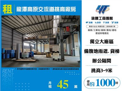 《詠騰工商團隊》 專營桃園工業地廠房出租出售 案名:龍潭高原交流道挑高廠房 [租金]:45萬 [坪數]:約1000坪【權狀+增建坪數】 [地理位置]:近高原交流道