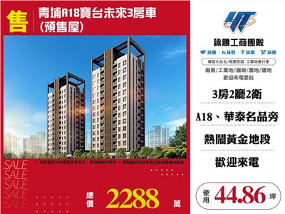 《詠騰工商團隊》 專營桃園房地產出租出售 案名:青埔A18寶台未來3房車(預售屋) [價格]:2288萬 [坪數]:約44.86坪【權狀+增建坪數】 [地理位置]:近青埔國小